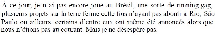 Finalizando o capítulo, Jarre comenta: “ Até o momento, ainda não toquei no Brasil. Meio que mordaça. Vários projetos em terra firme falharam no Rio, São Paulo ou em outros lugares. Alguns deles foram anunciados quando nem tínhamos conhecimento. Mas eu não me desespero.”
