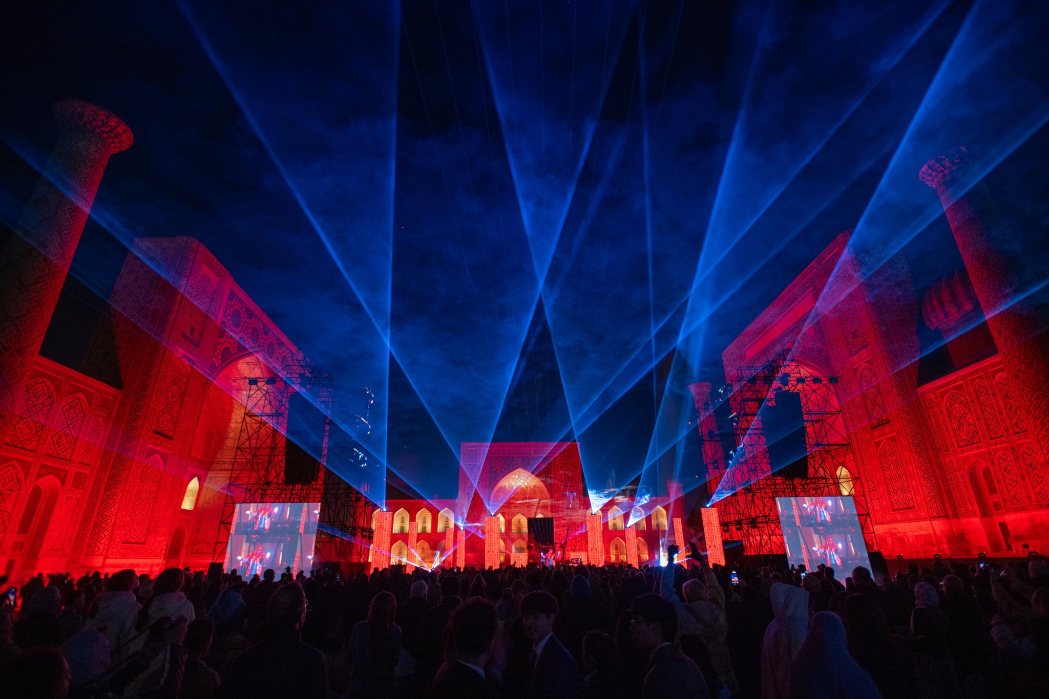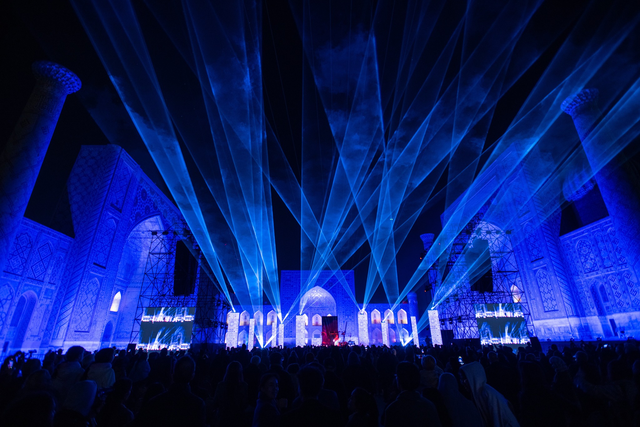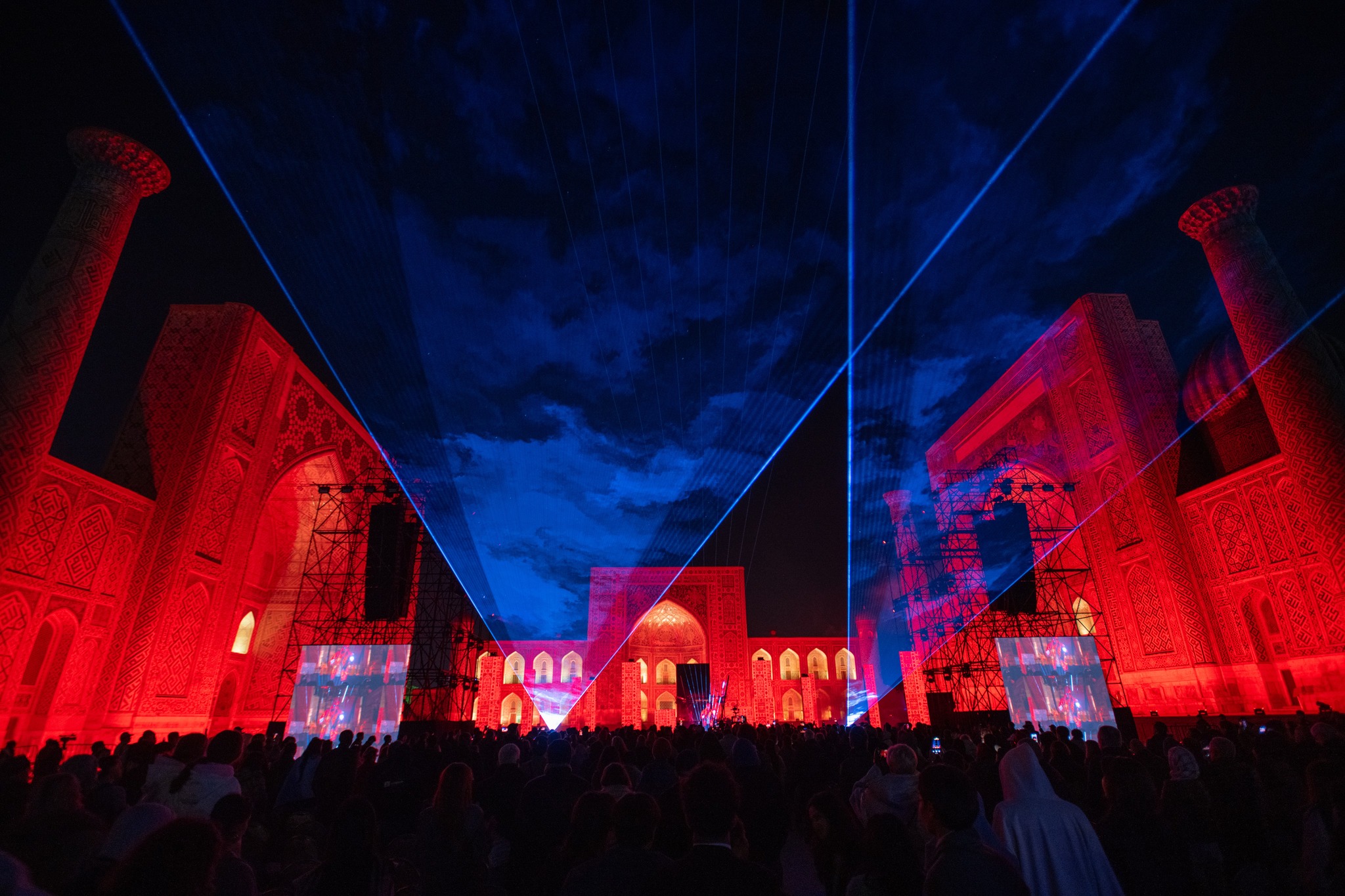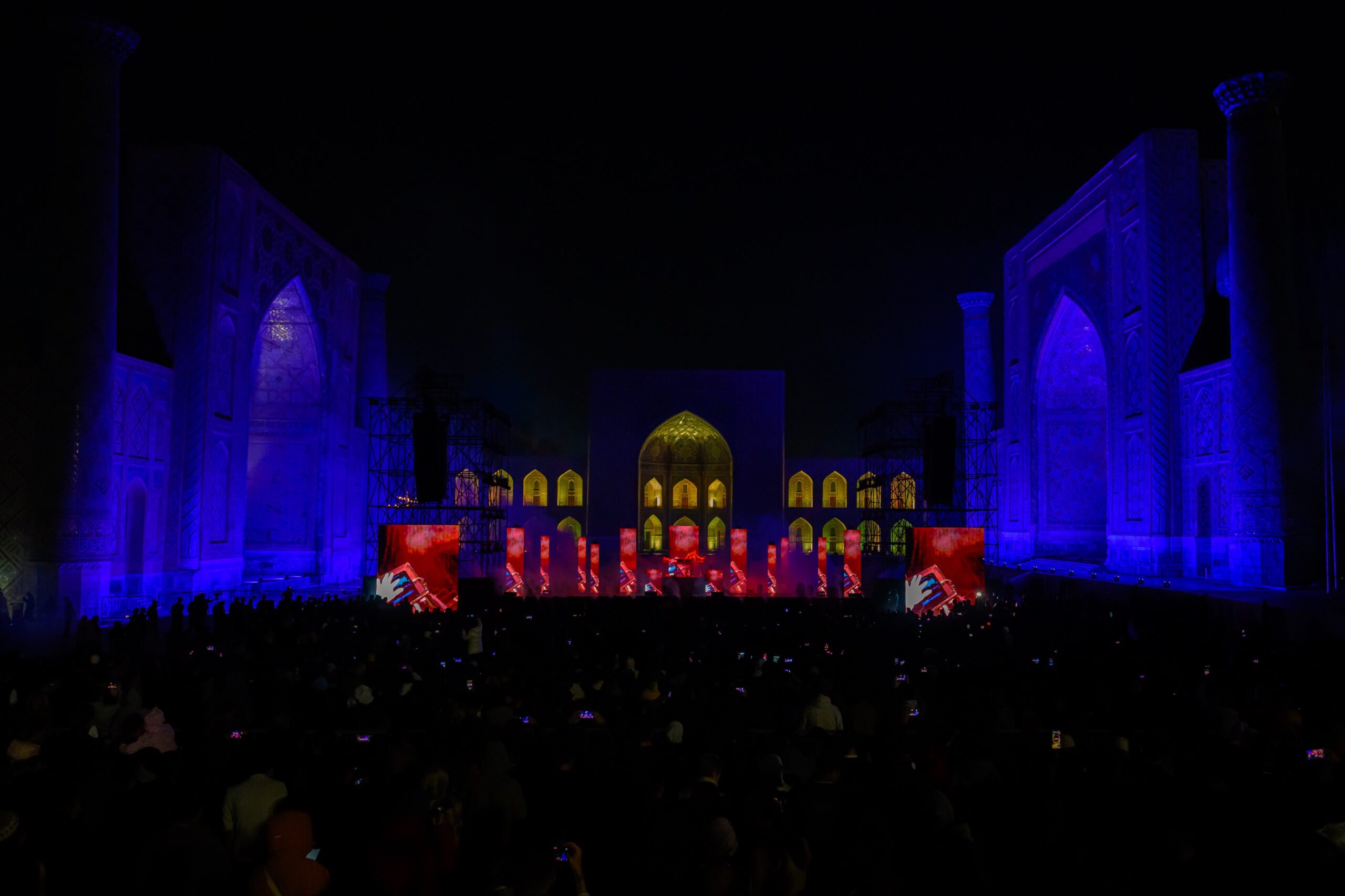 Neste fim de semana, seu deslumbrante concerto-tributo iluminou a Praça Registan em Samarcanda, transformando um dos locais históricos mais emblemáticos do mundo em uma sinfonia de luzes, som e arquitetura.