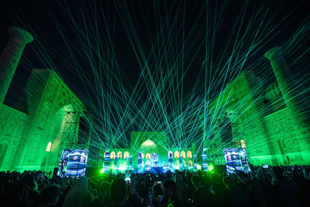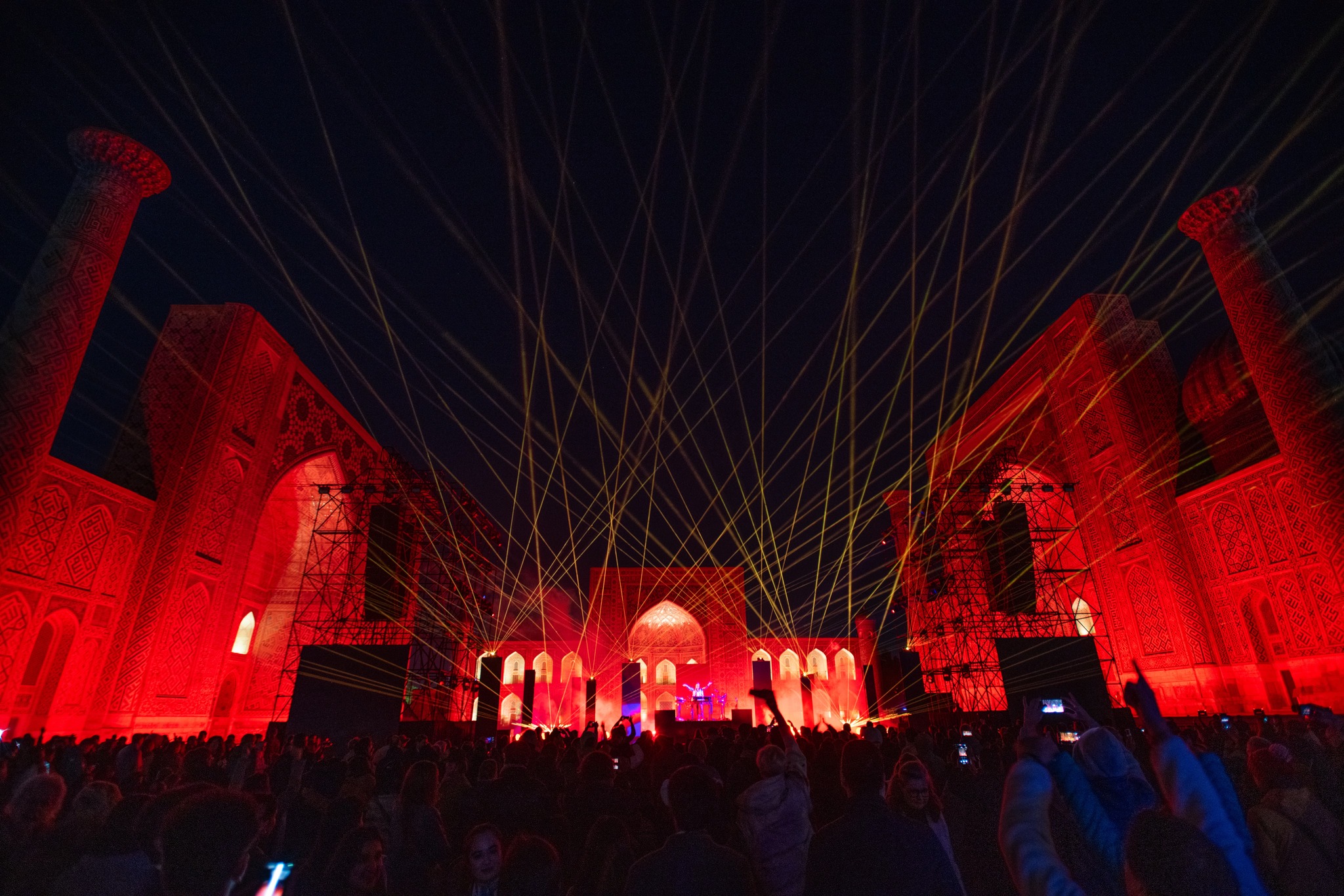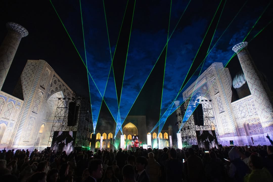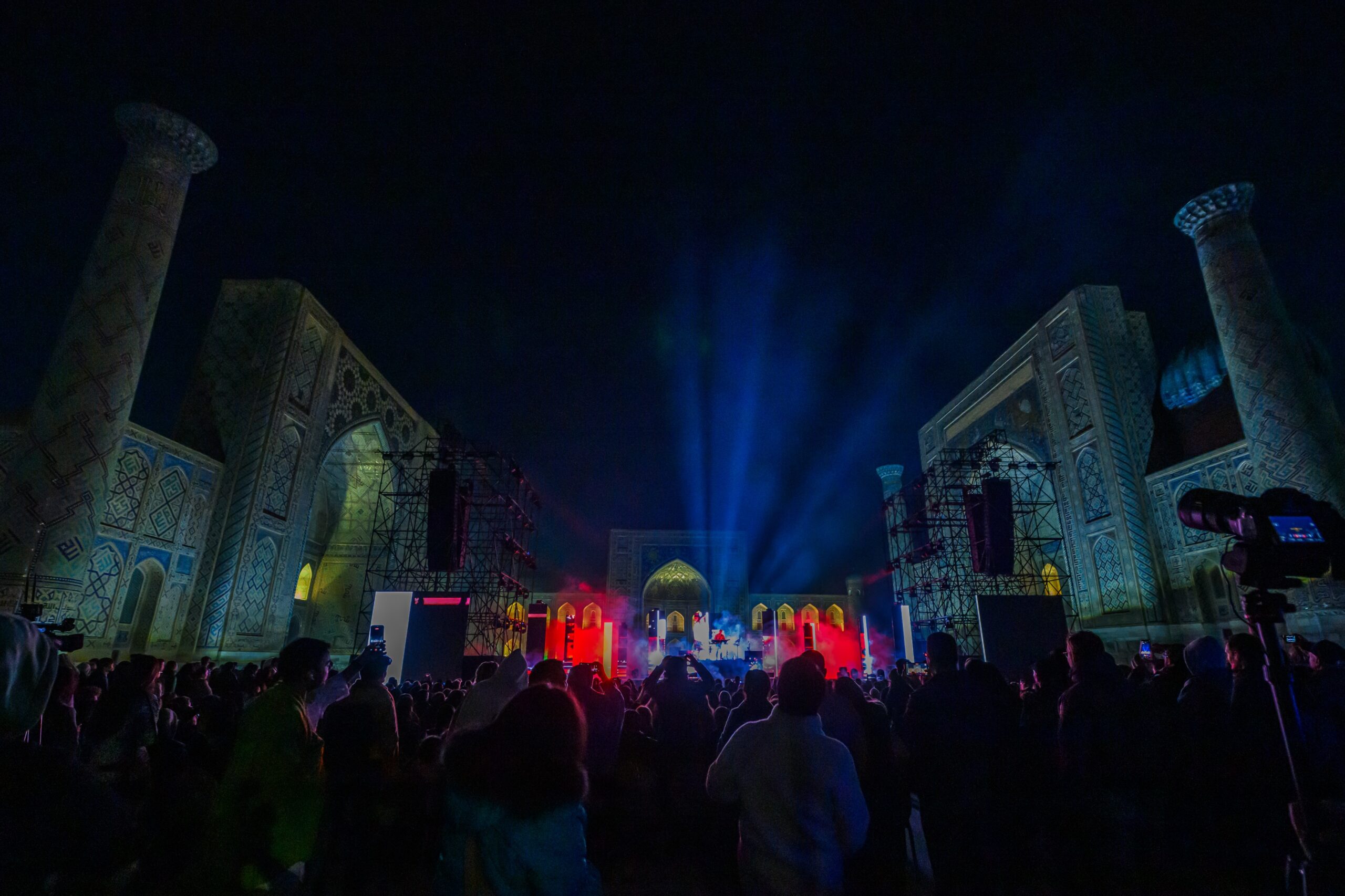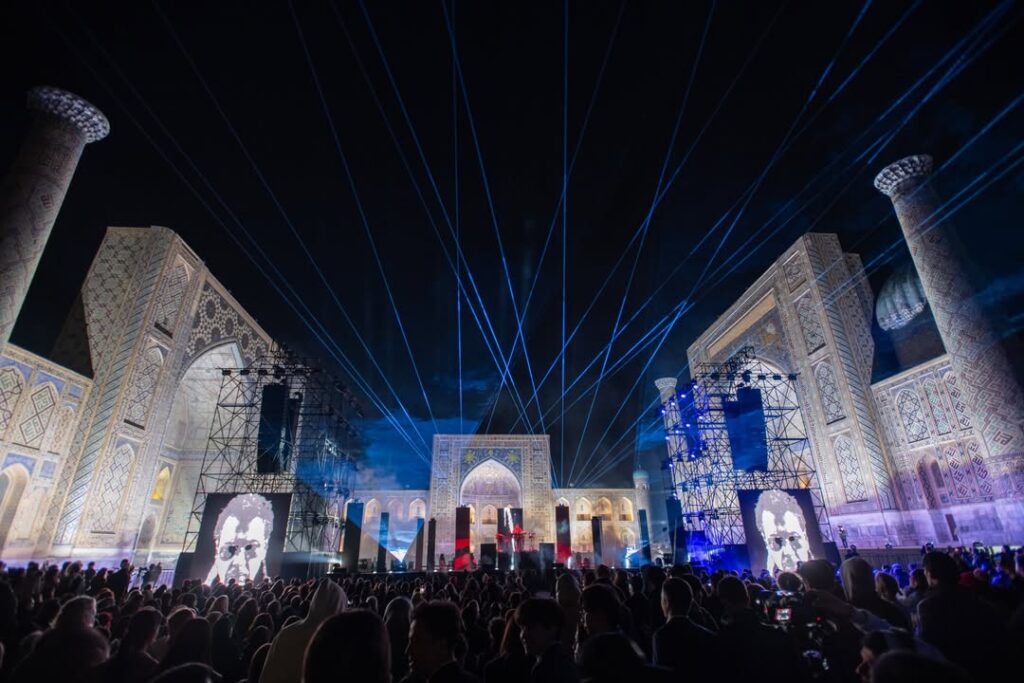 Neste fim de semana, seu deslumbrante concerto-tributo iluminou a Praça Registan em Samarcanda, transformando um dos locais históricos mais emblemáticos do mundo em uma sinfonia de luzes, som e arquitetura.