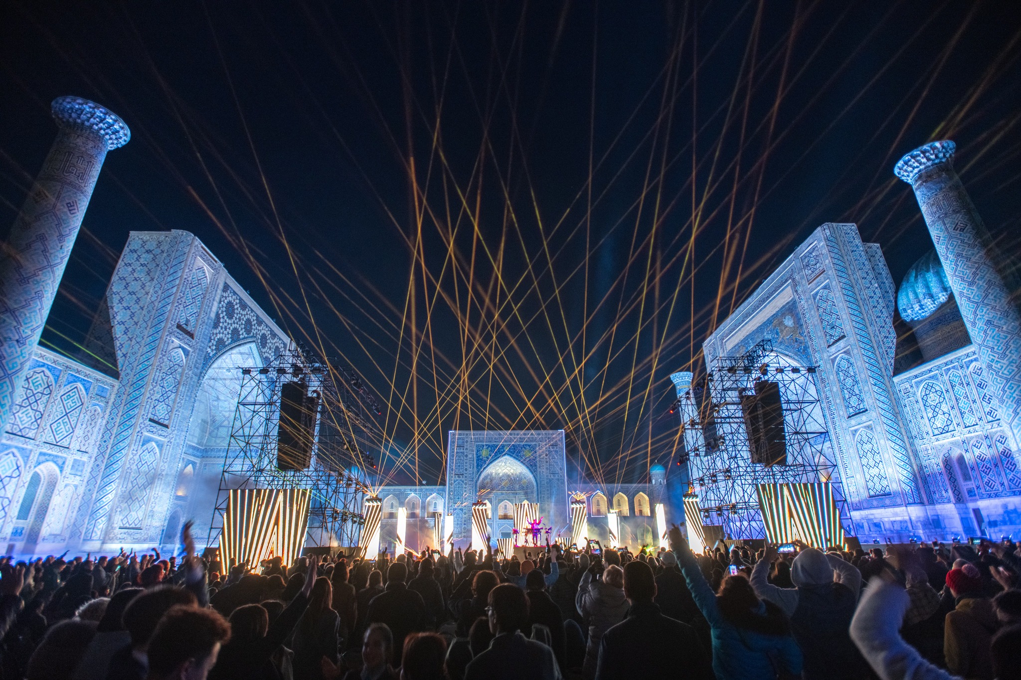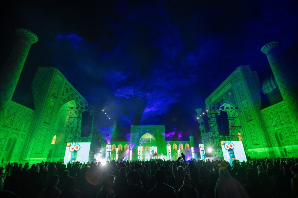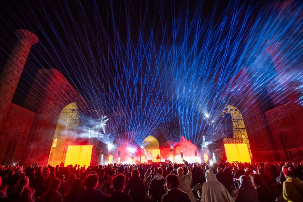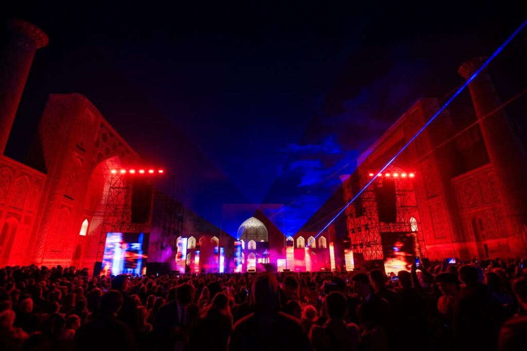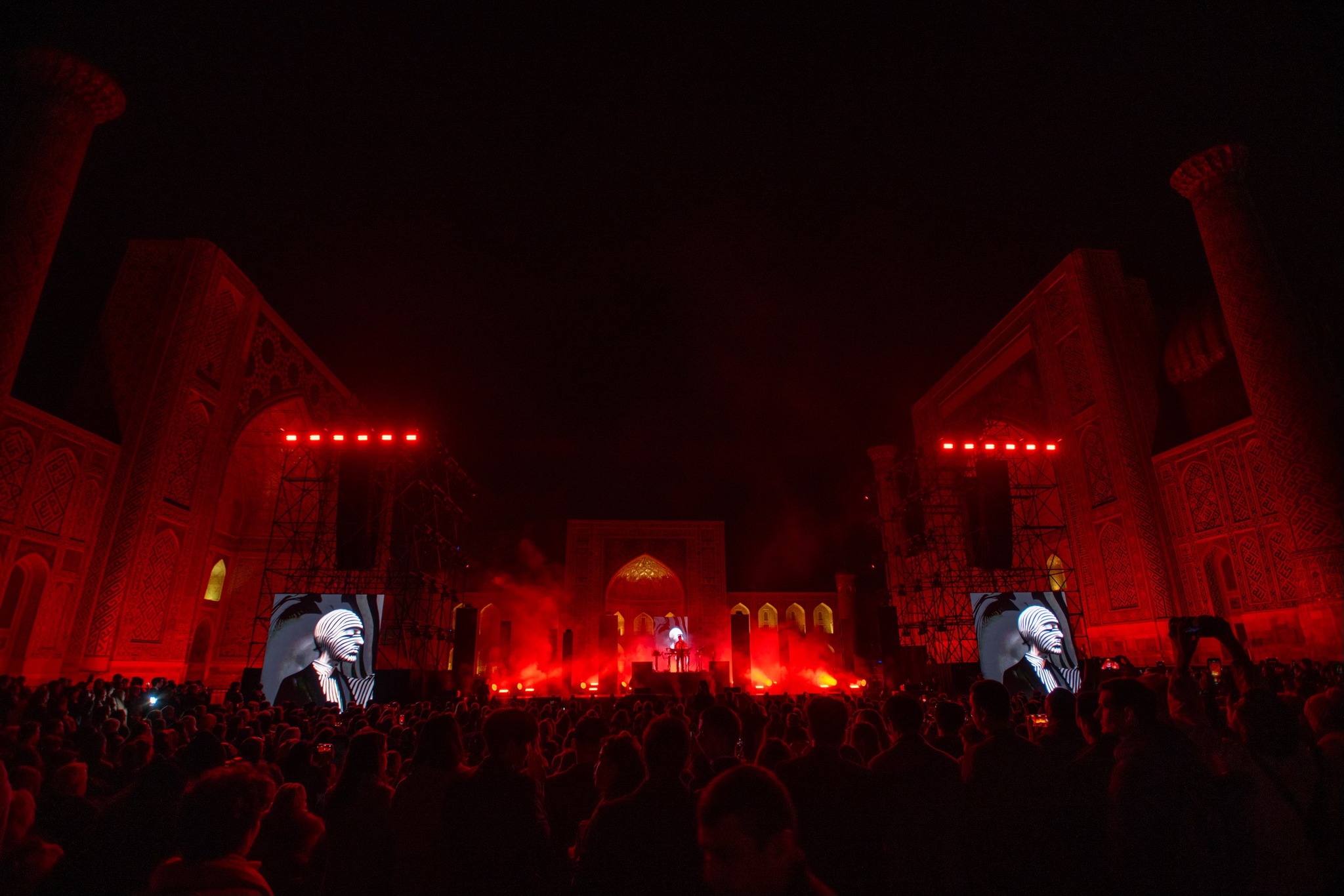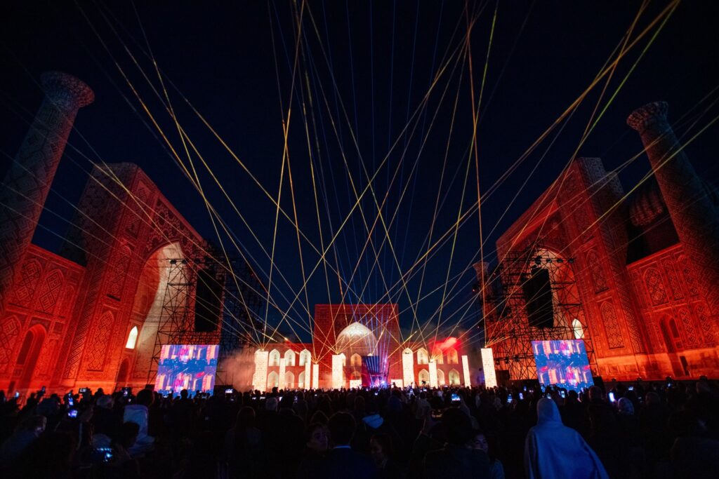 Neste fim de semana, seu deslumbrante concerto-tributo iluminou a Praça Registan em Samarcanda, transformando um dos locais históricos mais emblemáticos do mundo em uma sinfonia de luzes, som e arquitetura.