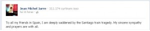 Nas suas redes sociais (Twitter e Facebook), o músico francês Jean Michel Jarre, deixou uma mensagem de condolências para as famílias das vítimas da tragédia com o trem que ia para Santiago de Compostela (Espanha). Mais de 70 pessoas, a maioria peregrinos que iriam participar da festa de Santiago, perderam a vida no acidente que aconteceu no dia 24 de julho. A festa foi cancelada após a tragédia.