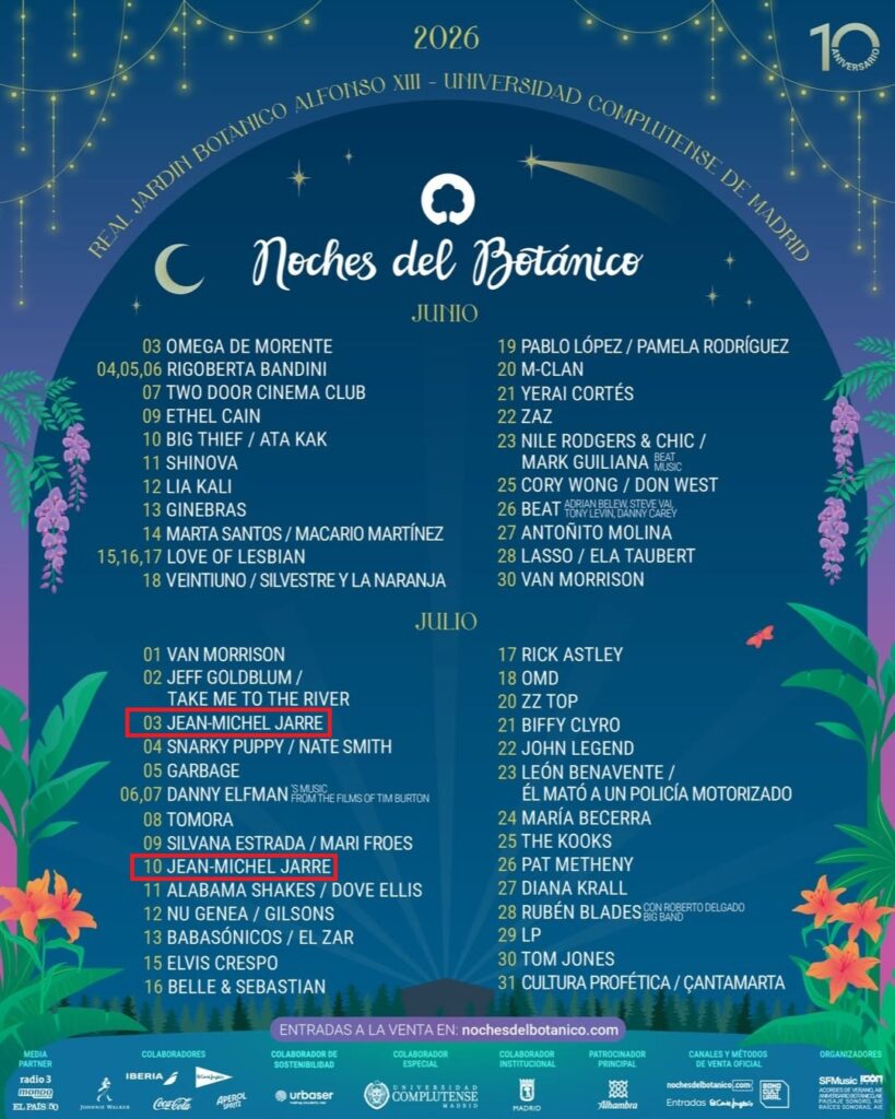 Após a primeira data com ingressos esgotados, um show extra de Jean-Michel Jarre foi adicionado ao Festival “Noches del Botánico”, em Madrid, no dia 3 de julho de 2026, no coração dos jardins botânicos da cidade.